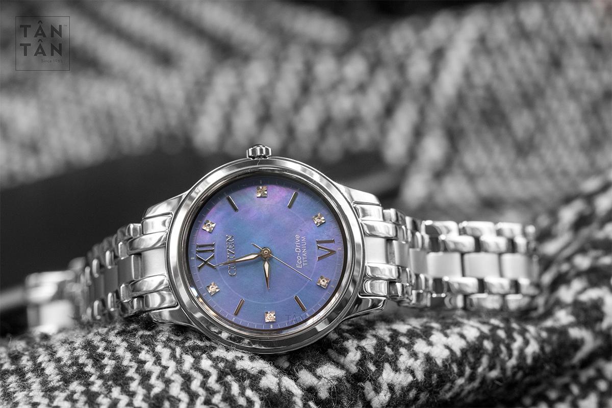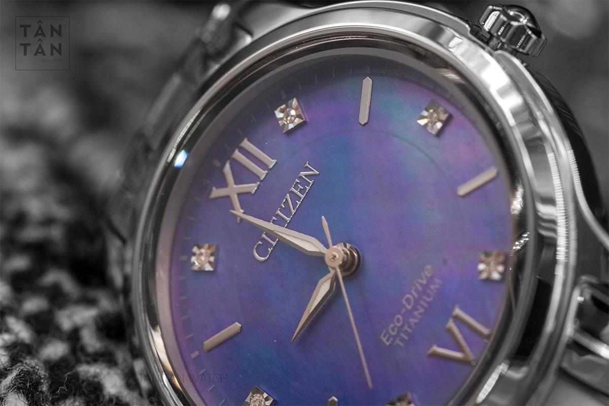 Cô nàng đồng hồ Citizen EM0720-85N thuộc dạng hiếm hoi sở hữu mặt khảm xà cừ màu xanh sóng biển