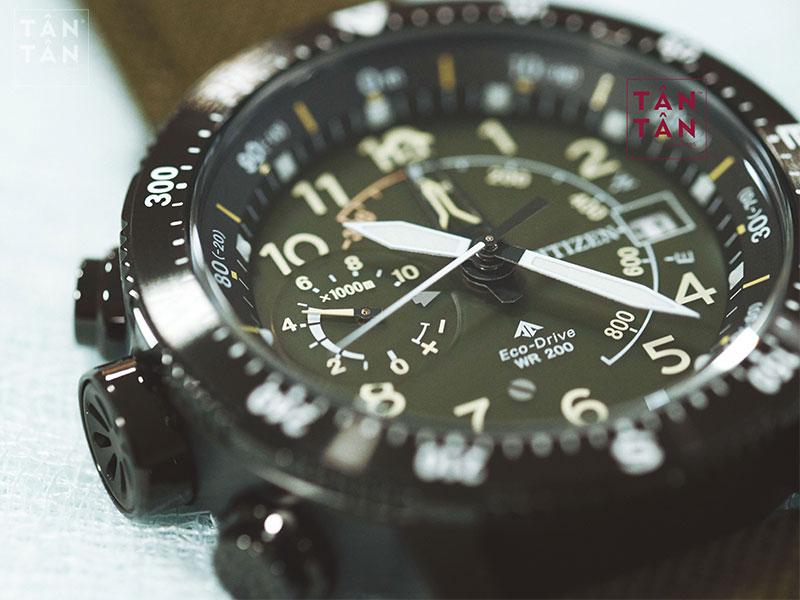 Bộ kim chính đồng hồ với thiết kế mạnh mẽ được vuốt nhọn dạng kiếm sắc nét, có thể phát sáng vào ban đêm nhờ chất dạ quang bên trên giúp người đeo có thể dễ dàng quan sát trong điều kiện thiếu sáng. Các cọc số dạng Arab với những đường nét thanh mảnh đầy quyến rũ giúp người dùng dễ đọc giờ khi nhìn lướt qua. Logo Citizen được đặc vị trí 12h và kí hiệu bộ máy Eco-Drive, logo Promaster tại vị trí 6h quen thuộc khẳng định cho dòng đồng hồ đặc biệt của Citizen. Ô lịch ngày được đặt tại vị trí 3h giúp người đeo dễ dàng quản lý công việc.