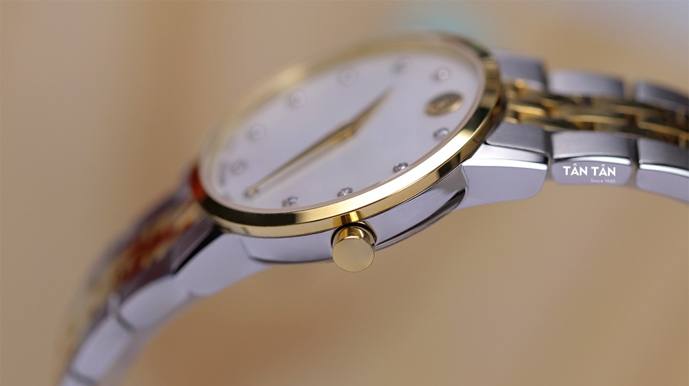 ✓ Mặt số khảm xà cừ màu trắng thanh lịch với các mốc giờ đính diamond lấp lánh sang trọng.