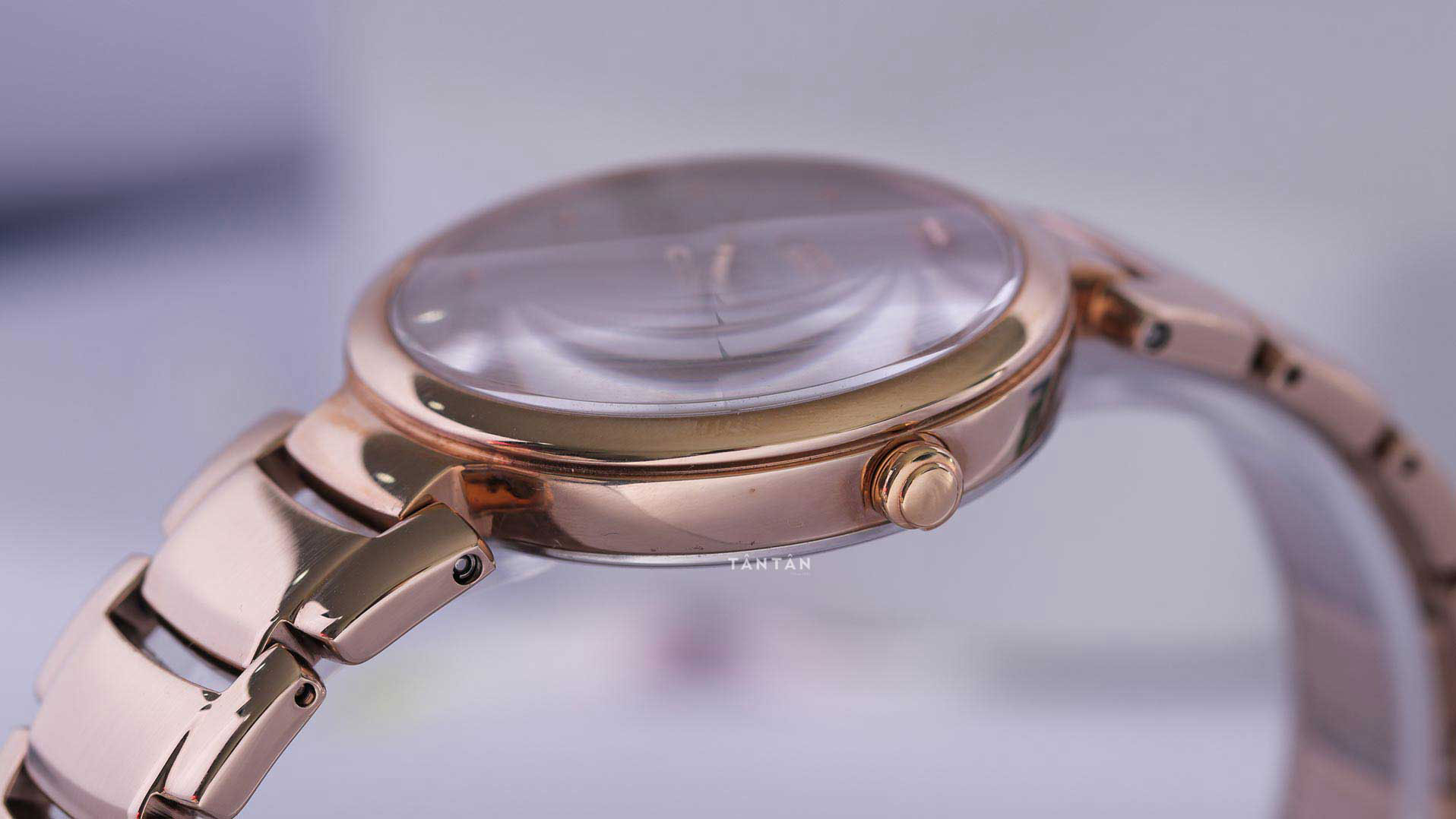Bộ vỏ đồng hồ nữ Citizen EM0853-81Y có đường kính là 31mm được chế tác bởi chất liệu thép không gỉ cao cấp với bề mặt mạ PVD màu vàng hồng, chủ yếu được đánh bóng để làm tăng tính sang trọng cho đồng hồ. Niềng bezel phía trên cũng được cắt gọt gọn gàng và vát thoải ra ngoài tạo độ thông thoáng cho mặt số đồng hồ. Và ở cạnh phải góc 3h quen thuộc là núm chỉnh giờ dạng tròn, thiết kế trơn nhẵn phù hợp tổng thể, dễ dàng kéo/đẩy để điều chỉnh thời gian. Ngoài ra, với độ chống nước ở mức WR50 (tương đương áp suất ở độ sâu 50m nước) hỗ trợ rửa tay, đi mưa hoặc đi tắm mà không lo đồng hồ bị vô nước.