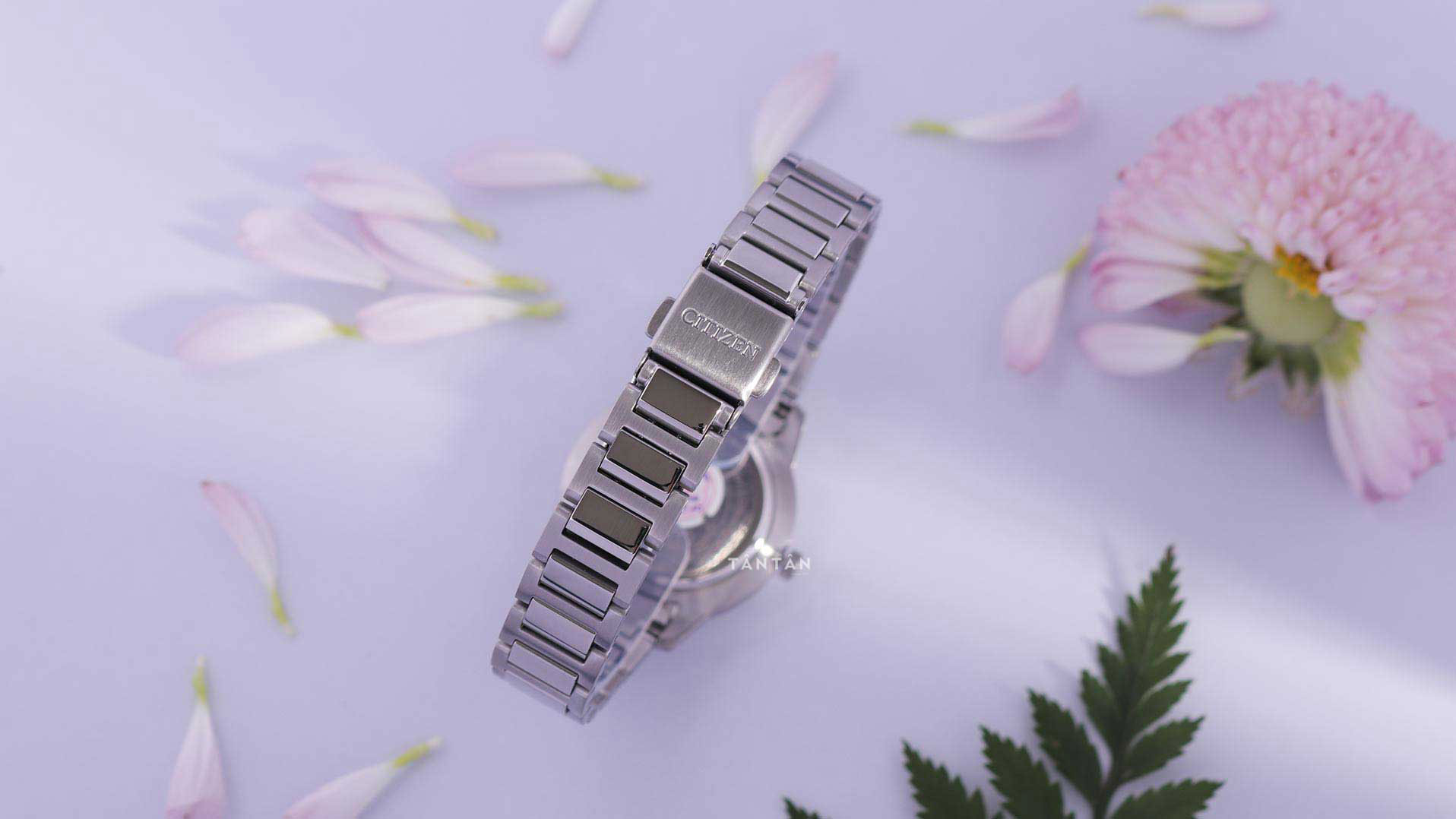 Dây đeo của Citizen EW2591-82D được làm từ thép không gỉ với thiết kế H-link với những mắt xích bo cong, mềm mại. Bộ dây có độ ôm tay rất tốt cũng như mang lại cảm giác thoải mái khi đeo, là sự lựa chọn hàng đầu cho các cô gái yêu thích phong cách sang trọng, tinh tế. Thêm vào đó, dây đeo cũng được xử lý bề mặt tỉ mỉ khi xen kẽ đánh phay xước và sáng bóng giúp dây đeo thẩm mỹ và thời trang hơn.