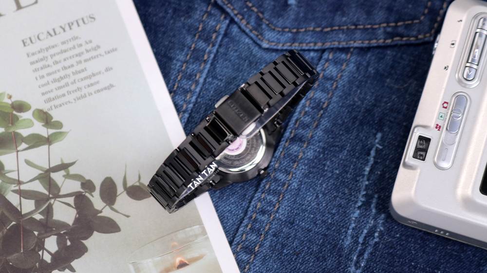 Dây đeo của đồng hồ nữ Citizen EW2597-86E được làm từ thép không gỉ với thiết kế H-link với những mắt xích bo cong, mềm mại. Bộ dây có độ ôm tay rất tốt cũng như mang lại cảm giác thoải mái khi đeo, là sự lựa chọn hàng đầu cho các cô gái yêu thích phong cách sang trọng, tinh tế. Thêm vào đó, dây đeo cũng được mạ ion đen đồng điệu tổng thể và xử lý bề mặt tỉ mỉ khi xen kẽ đánh phay xước và sáng bóng giúp dây đeo thẩm mỹ và thời trang hơn. Kết hợp bộ dây là khóa gập phổ biến trên những mẫu đồng hồ Citizen kết hợp với nút bấm thông minh thuận tiện cho việc thao tác mở ra - đeo vào giúp cố định đồng hồ chắc chắn trên cổ tay.