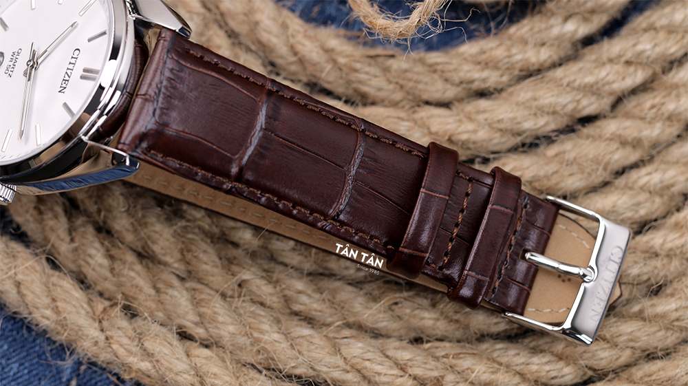 Citizen BI5090-09A được trang bị dây da cao cấp, bền nhẹ thuộc nâu bề mặt tạo nên vẻ ngoài thanh lịch và trưởng thành. Lựa chọn sử dụng chất liệu da thật bền bỉ, dập vân da cá sấu gam màu nâu cánh gián, Citizen mong muốn mang đến cho người dùng cảm giác mỏng nhẹ, êm ái và thoải mái khi đeo. Bởi vì dây đeo của Citizen BI5090-09A có cấu trúc 2 lớp được may chắc chắn bởi đường chỉ tỉ mỉ dọc viền dây, với lớp da bên trong mềm mại tránh kích ứng da và gây khó chịu khi đeo trong thời gian dài. Đi kèm với dây da là khóa cài đơn giản, dễ dàng đeo vào - tháo ra cố định chắc chắn trên cổ tay.