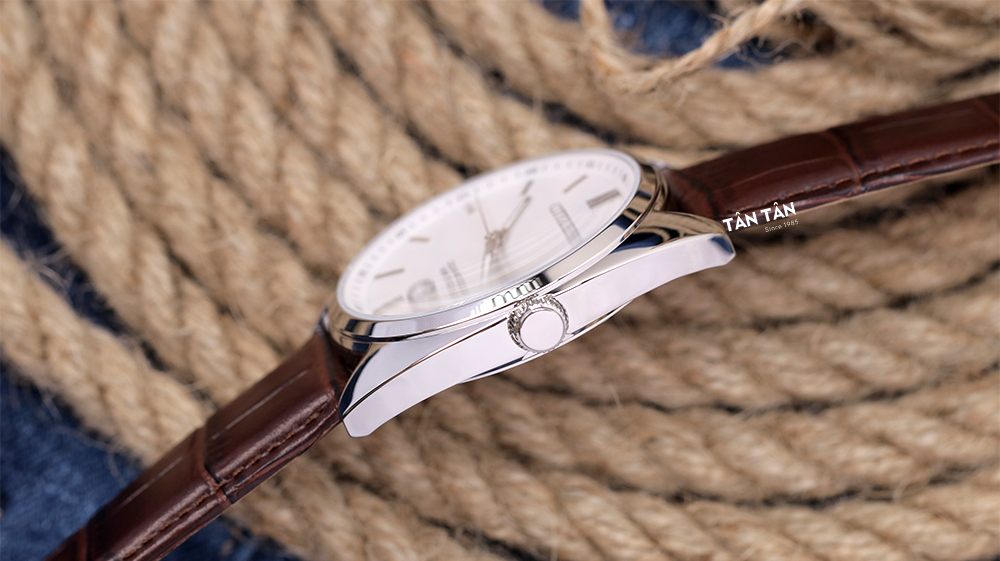 ✓ Mặt số bo tròn phủ màu trắng trang nhã với bộ kim dạng kiếm, các mốc giờ index nổi khối, tinh xảo nổi bật.