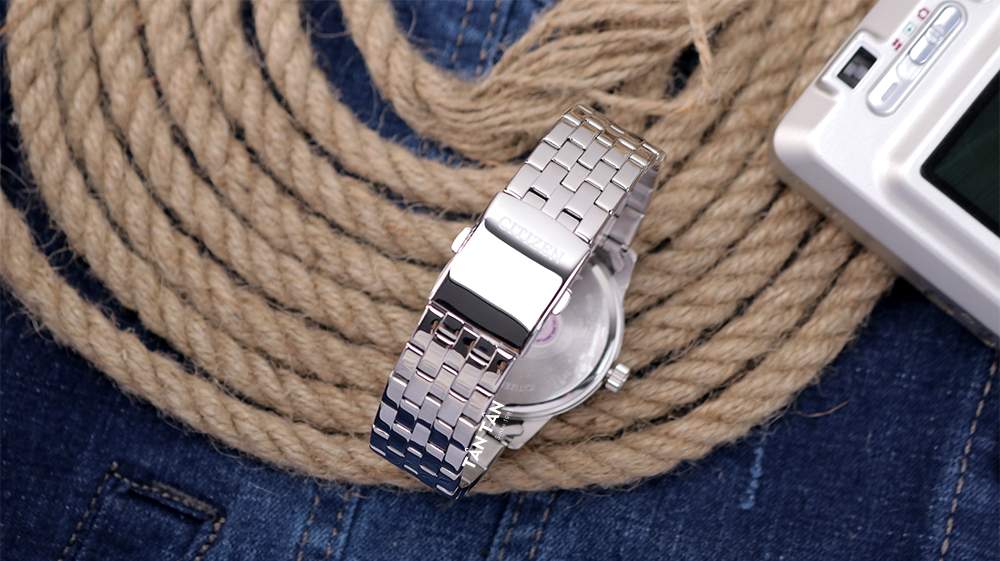Citizen BI5090-50A được trang bị dây đeo thép không gỉ thiết kế 5 mặt liên kết chắc chắn, uyển chuyển ôm trọn cổ tay người đeo. Việc thiết kế nhiều mắt nhỏ giúp làm “mềm” tính cứng của chất liệu cùng cách hoàn thiện bề mặt bóng-mờ hiện đại, mang đến vẻ ngoài sáng bóng, thời thượng giúp các chàng thêm phần lịch lãm, sang trọng khi diện chiếc đồng hồ nam này trên tay. Đi kèm dây đeo kim loại là khóa gập chắc chắn được hoàn thiện xước phay dập logo tinh tế, được trang bị thêm nút bấm thông minh, dễ dàng đeo vào - tháo ra và chắc chắn trên cổ tay.