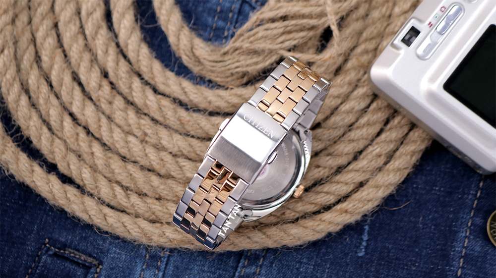 Citizen BI5096-53L được trang bị dây đeo thép không gỉ thiết kế 5 mặt liên kết chắc chắn, uyển chuyển ôm trọn cổ tay người đeo. Việc thiết kế nhiều mắt nhỏ giúp làm “mềm” tính cứng của chất liệu cùng cách hoàn thiện bề mặt bóng-mờ hiện đại, phối demi màu vàng hồng ở 3 liên kết giữa mang đến vẻ ngoài sáng bóng, thời thượng giúp các chàng thêm phần lịch lãm, sang trọng khi diện chiếc đồng hồ nam thời trang này trên tay. Đi kèm dây đeo kim loại là khóa gập chắc chắn được hoàn thiện xước phay dập logo tinh tế, được trang bị thêm nút bấm thông minh, dễ dàng đeo vào - tháo ra và chắc chắn trên cổ tay.