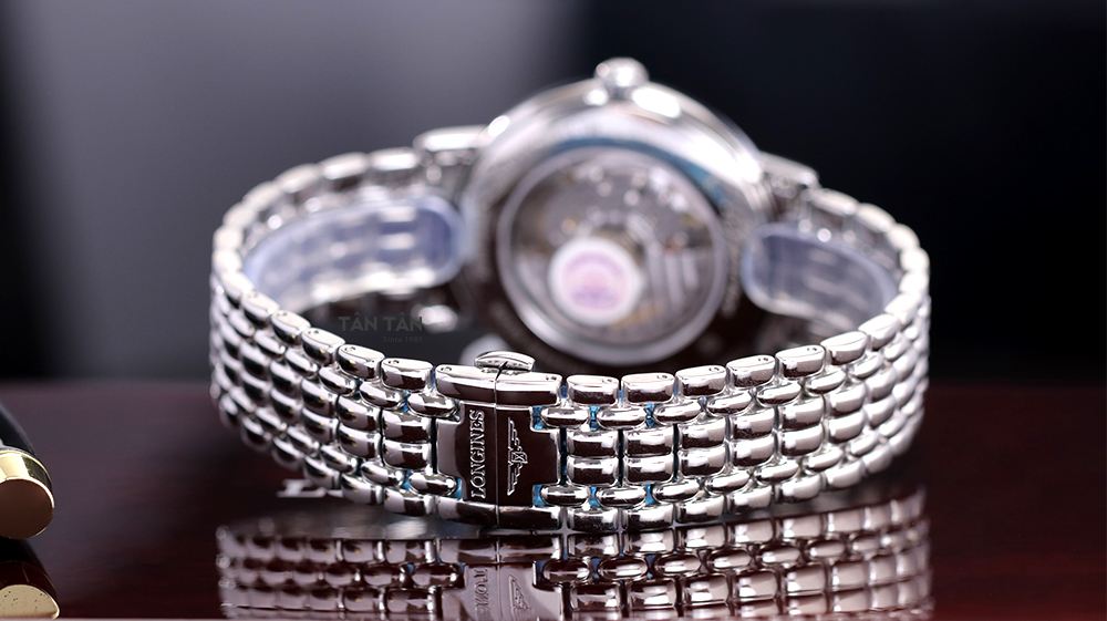 ✓ Dây đeo thép thiết kế hạt gạo được phủ satin sáng bóng đặc trưng thương hiệu Longines.