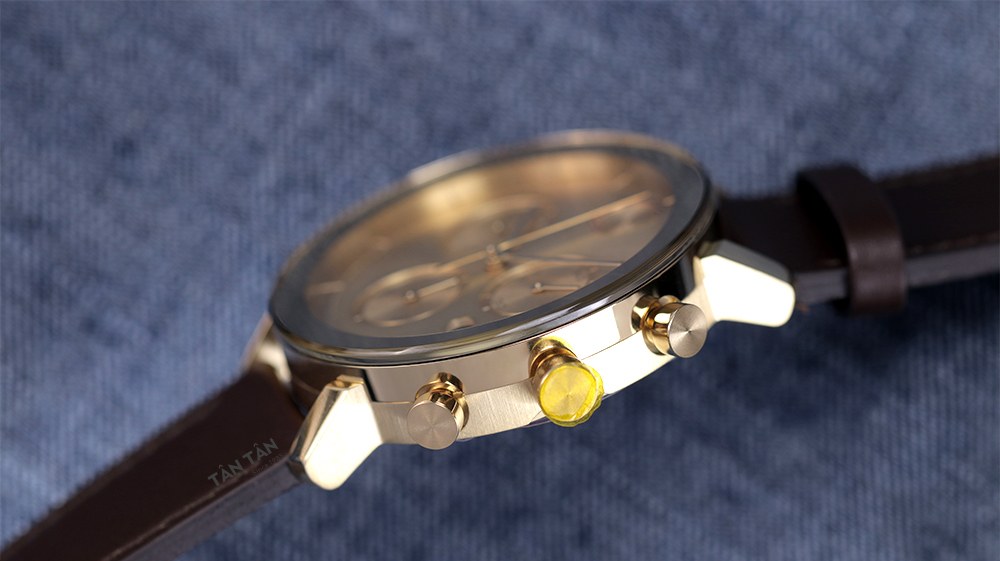 Bộ vỏ thép chắc chắn mạ PVD màu vàng gold hoàn thiện bóng-mờ thẩm mỹ trang bị 3 nút chuẩn chronograph