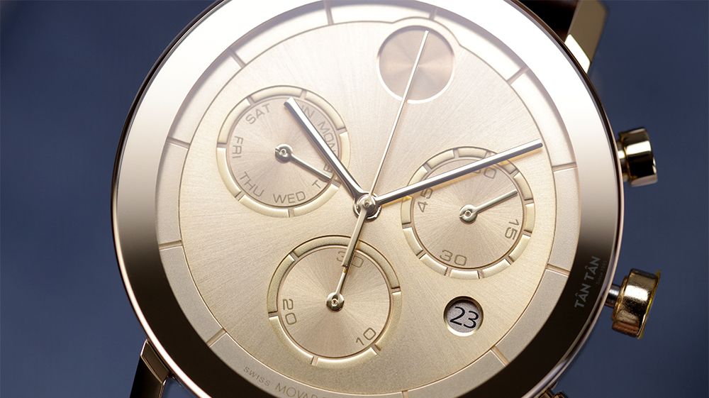 ✓ Mặt số thiết kế kiểu multi-dial hiện đại đậm chất Movado: Ô lịch thứ, 60 giây và 30 phút.