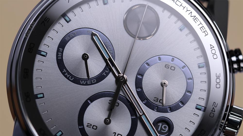 Mặt số hoàn thiện vân sunray xám với thiết kế multi-dial phong cách thể thao