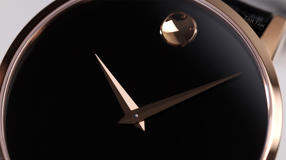 ✓ Mặt số trơn đen tuyền nổi bật “một chấm hai kim” đặc trưng của Movado.