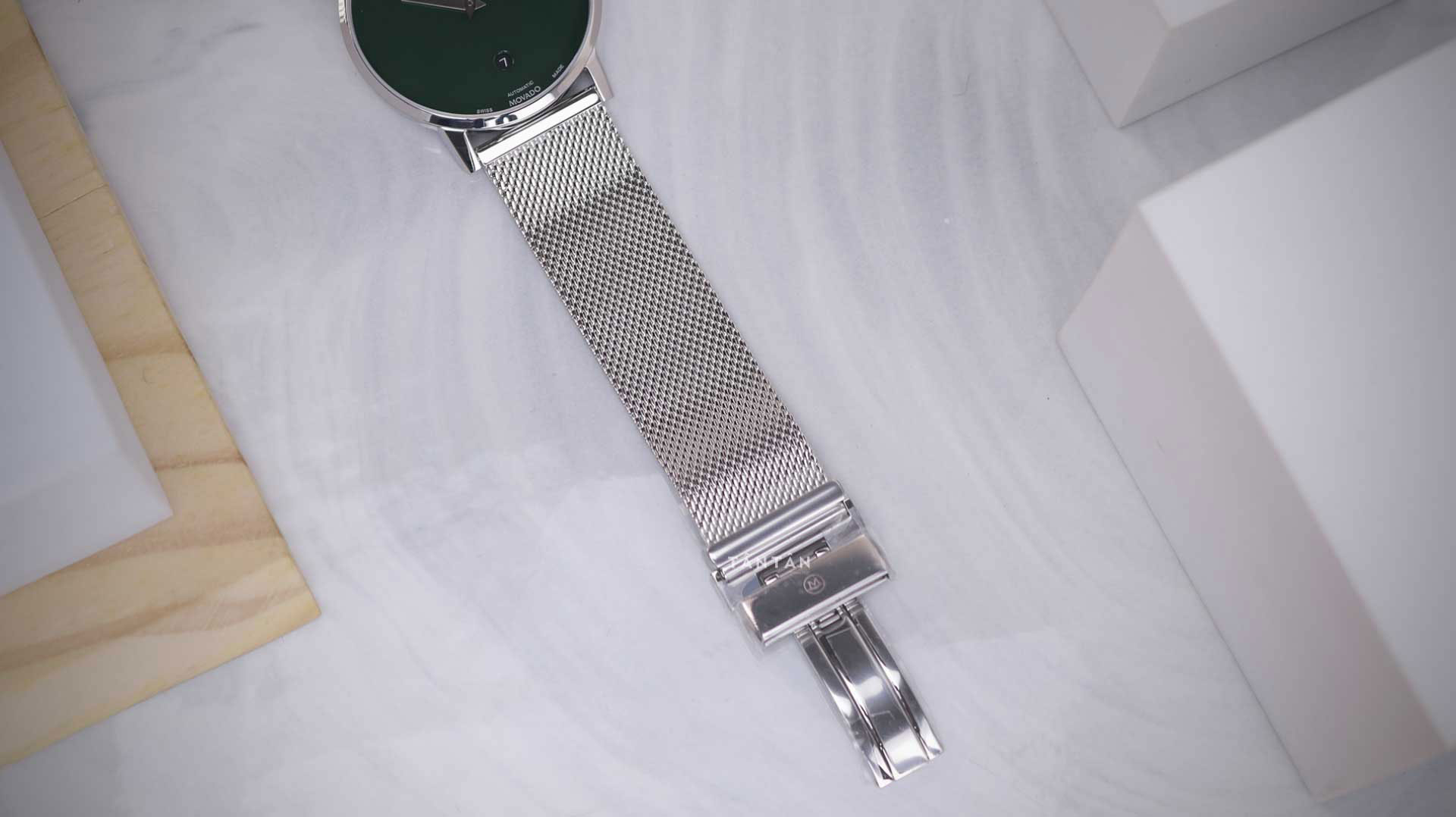 Dây đeo đồng hồ Movado 0607649 được chế tác bằng thép không gỉ dạng lưới, đây được coi là loại dây không có khuyết điểm. Vì vậy, dây lưới đồng hồ luôn mềm mại, dẻo dai, ôm sát cổ tay người đeo với mạng lưới liên kết chắc chắn này rất khó bị phá hủy, khó bị trầy xước do tác động ngoại lực và bền bỉ với thời gian. Thêm vào đó, bằng việc kết hợp dây đeo thép sáng bóng sẽ mang đến phong cách thời trang ấn tượng, làm nổi bật sự sang trọng, trang nhã cho người đeo. Đi kèm với dây lưới là khóa gập với cơ chế trượt để đóng, giúp dây đeo gọn gàng vừa vặn và chắc chắn trên cổ tay.