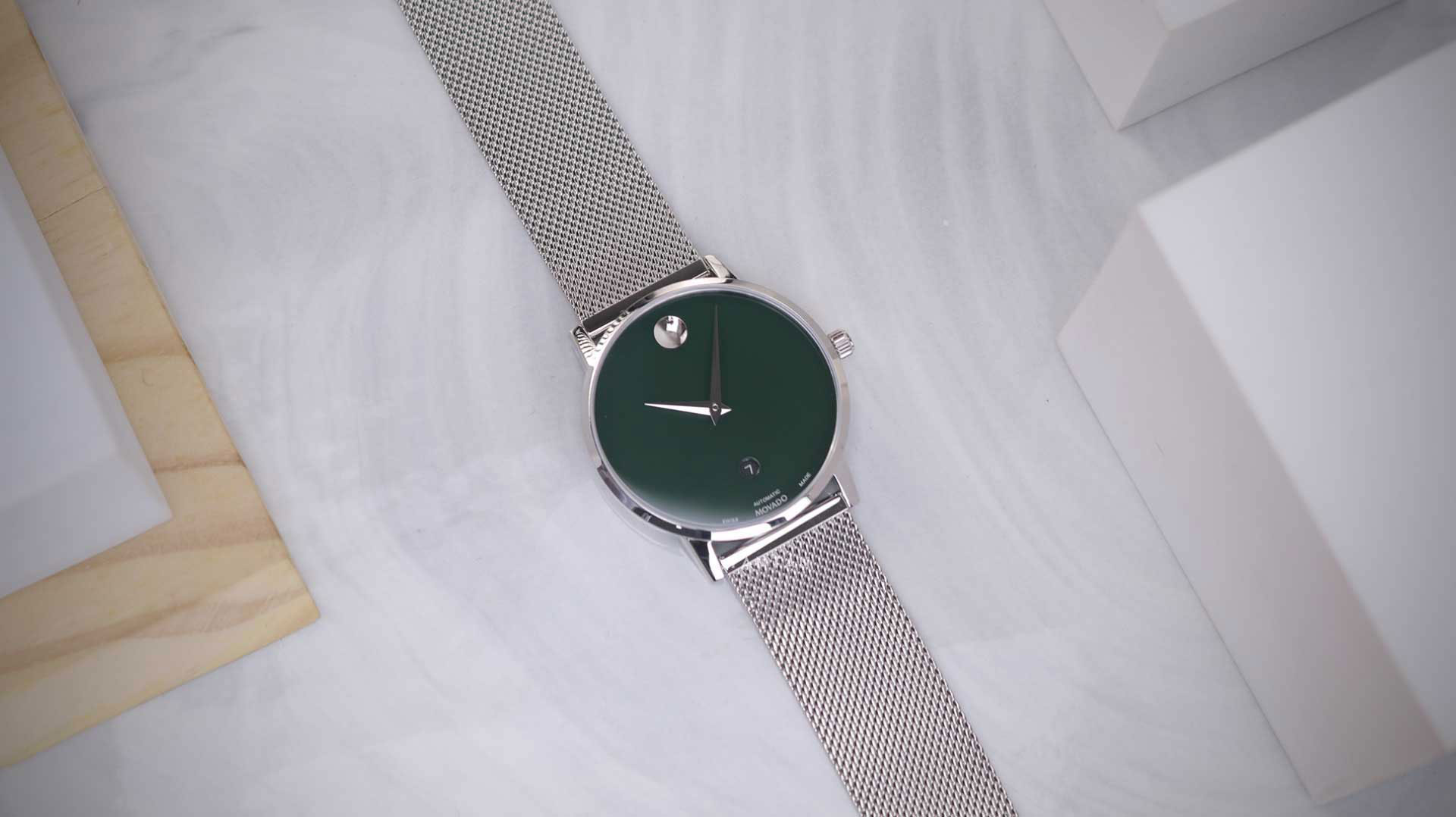 ✓ Mặt số xanh lục thời thượng với đặc trưng “Một chấm hai kim” đậm chất Movado.