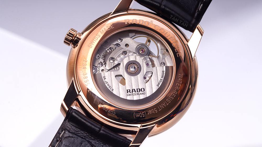✓ Vỏ ngoài bằng thép không gỉ mạ PVD vàng hồng được đánh bóng theo kỹ thuật đặc biệt của Rado mang lại độ sáng khác biệt.
