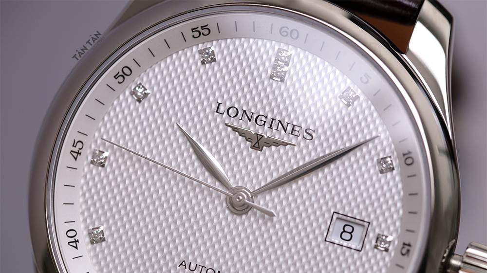 Ấn tượng đầu tiên khi nhìn vào Longines L2.793.4.77.3 là mặt số với tông màu bạc “barleycorn” ấn tượng. Trên nền mặt số có những vân bạc hình “lúa mì barleycorn” đan xen với nhau tạo hiệu ứng ánh sáng bắt mắt. Đây là thiết kế đặc trưng của Longines và nhiều đồng hồ phân khúc trung hay cao cấp của nhiều thương hiệu. Tại vị trí trung tâm mặt số là bộ kim leaf sắc sảo và phóng khoáng, điểm đặc biệt của Longines L2.793.4.77.3 là các mốc giờ đính 13 viên kim cương cao cấp với tổng trọng lượng 0.059 carats, đạt chuẩn VS-SI đã tạo nên danh tiếng cho những mẫu Longines đính kim cương. Xung quanh viền đồng hồ là những chữ số arab nhỏ nhắn đánh dấu theo các vạch chỉ phút giúp các chàng dễ dàng quan sát thời gian khi đeo.
