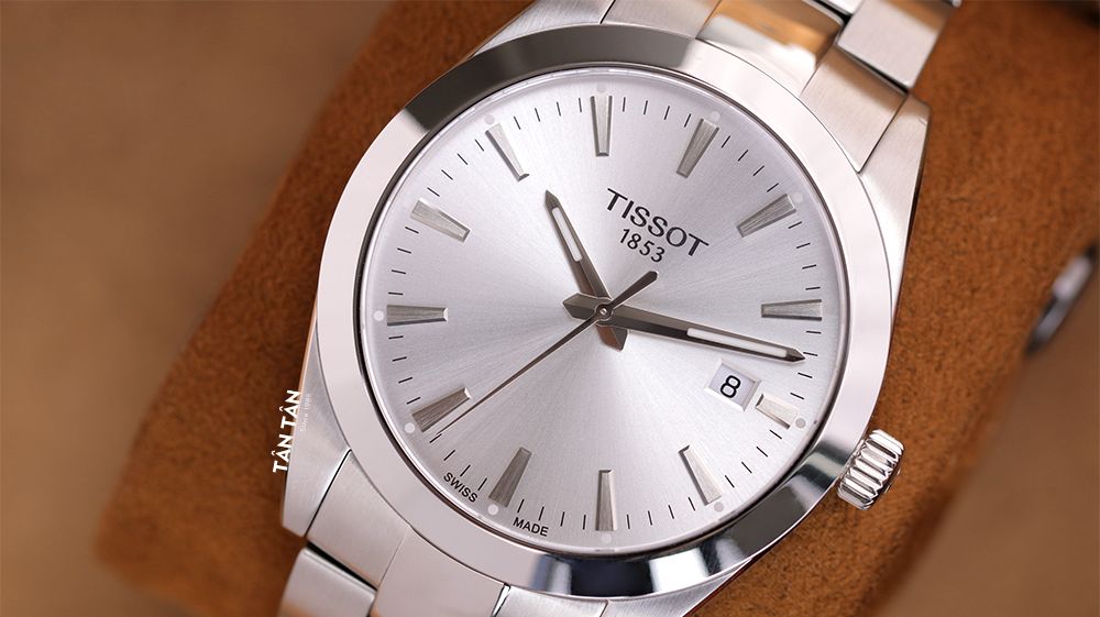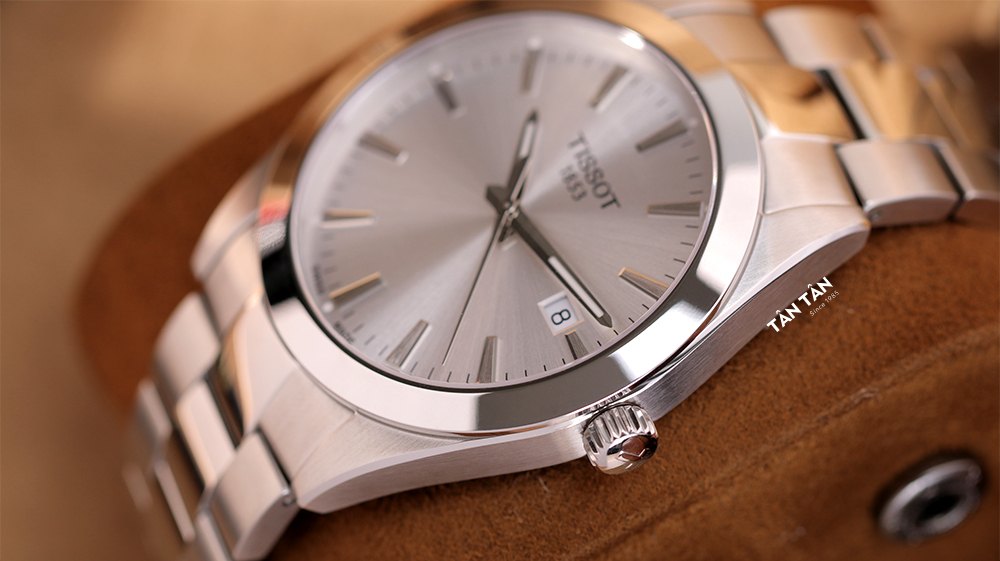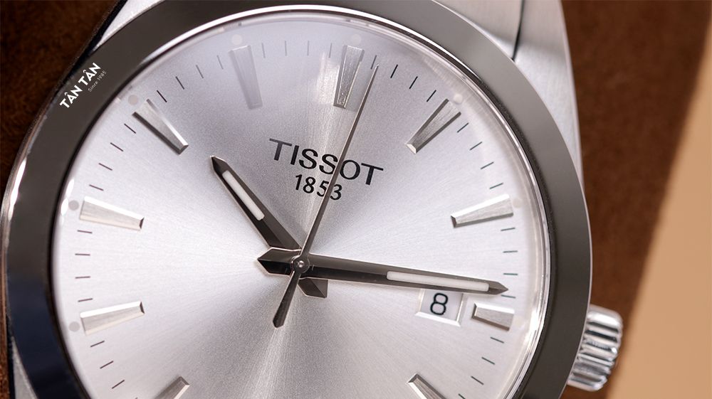 Những thông tin cơ bản của thương hiệu Tissot cũng được thể hiện đầy đủ và chi tiết. Bên dưới vị trí 12 giờ là tên thương hiệu và năm thành lập “Tissot 1853”, bên trên góc 6 giờ là khẳng định chất lượng sản phẩm Swiss Made đẳng cấp thế giới. Thông tin lịch ngày được thể hiện bên trong ô chữ nhật nhỏ bên cạnh vị trí 3 giờ quen thuộc, giúp cho người dùng dễ dàng quan sát.