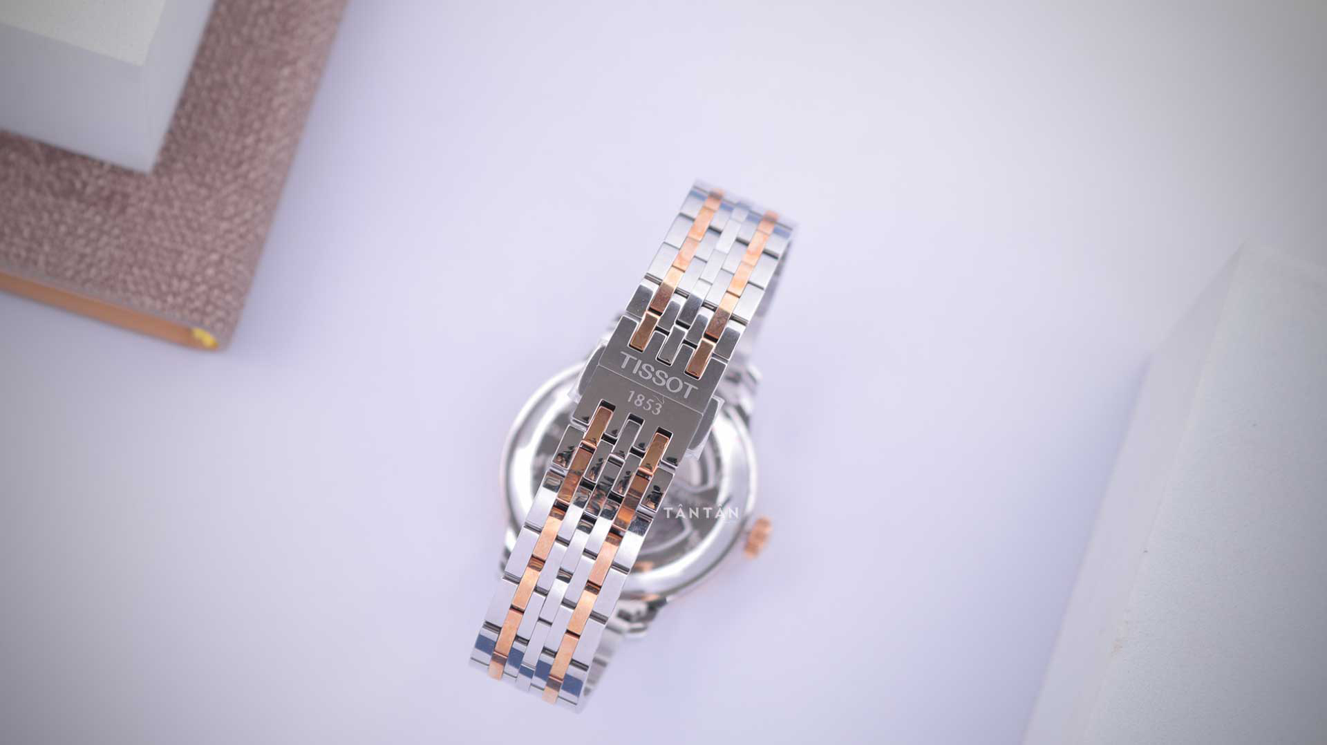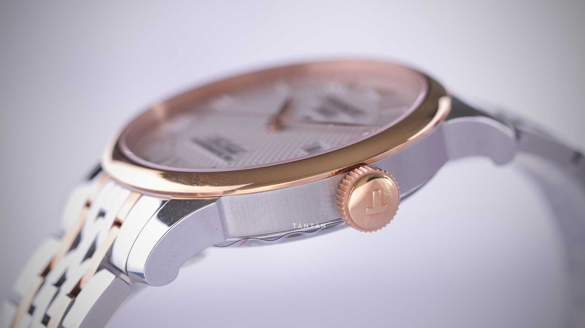 Ở cạnh phải là núm chỉnh dạng nắp chai được hoàn thiện sắc sảo với các đường khía rãnh và logo chữ T đặc trưng của Tissot được khắc nổi trên bề mặt núm, một lần nữa khẳng định giá trị thương hiệu. Niềng bezel có thiết kế bo tròn mềm mại, mạ màu vàng hồng thêm điểm nhấn nổi bật cho mặt số, được đánh bóng tỉ mỉ đồng bộ với bộ vỏ tạo nên một tổng thể thiết kế hài hòa, dịu mắt. Với đường kính vỏ 39.3mm, mẫu đồng hồ này sẽ phù hợp cho cổ tay từ 15.5cm cùng độ chống nước 3ATM hỗ trợ đi mưa và rửa tay.