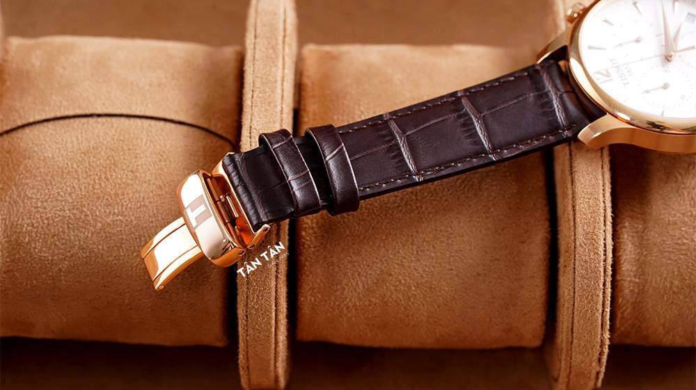 Bên cạnh đó, T063.610.36.037.00 được trang bị dây da cao cấp chính hãng màu nâu sẫm mang lại vẻ ngoài thanh lịch, sang trọng, đúng chuẩn một quý ông. Chất liệu da được hoàn thành tỉ mỉ từng đường kim mũi chỉ, qua nhiều khâu xử lý và kiểm định chất lượng nên khách hàng có thể yên tâm về độ bền. Hơn nữa, dây đeo đồng hồ chế tác hoàn toàn từ da bê may chỉ tệp màu chắc chắn sau đó tạo bề mặt bằng kỹ thuật dập vân không những đẹp mà còn cho cảm giác nhẹ nhàng trên cổ tay kèm theo sự bền bỉ, thoải mái với bề mặt dưới hút ẩm tốt. Đi kèm dây đeo là khóa cân bằng tiện lợi dễ dàng đeo vào - tháo ra, giúp hạn chế bị gãy, hư dây.