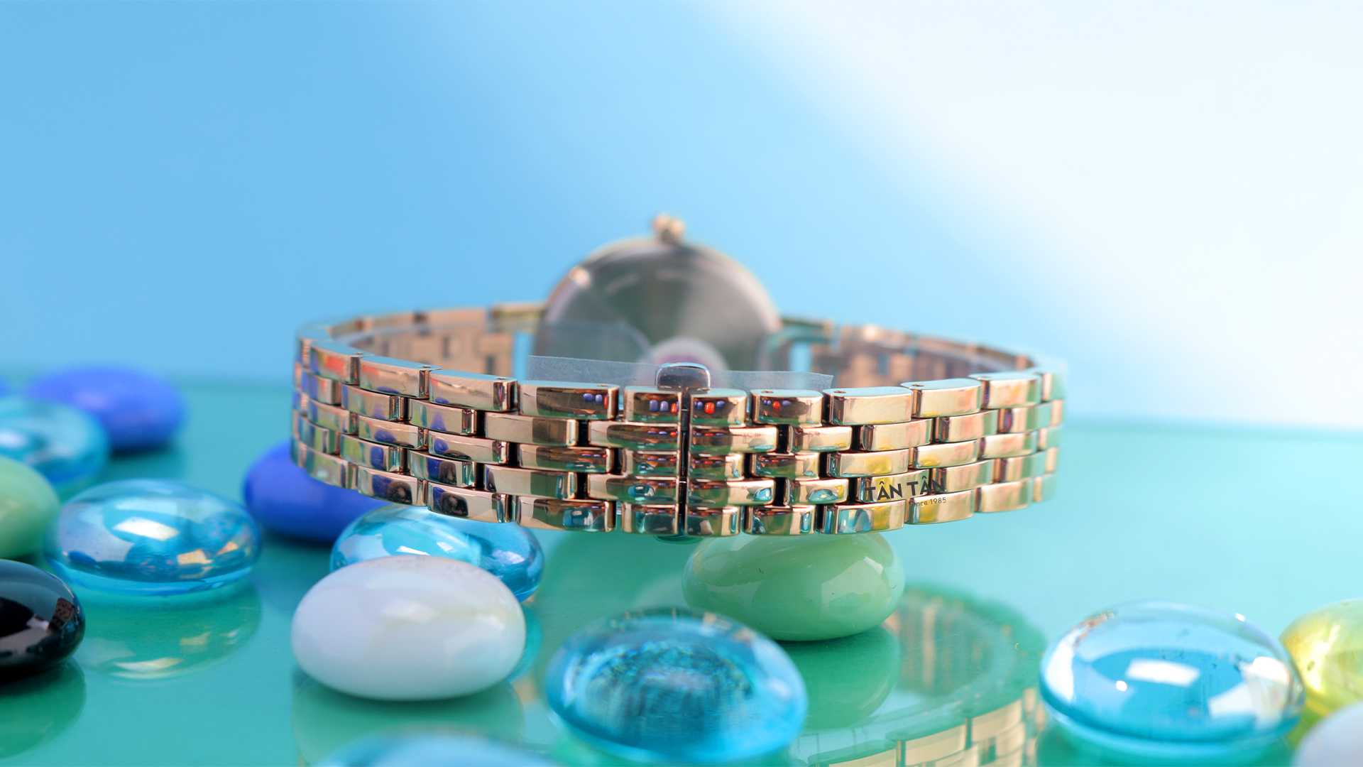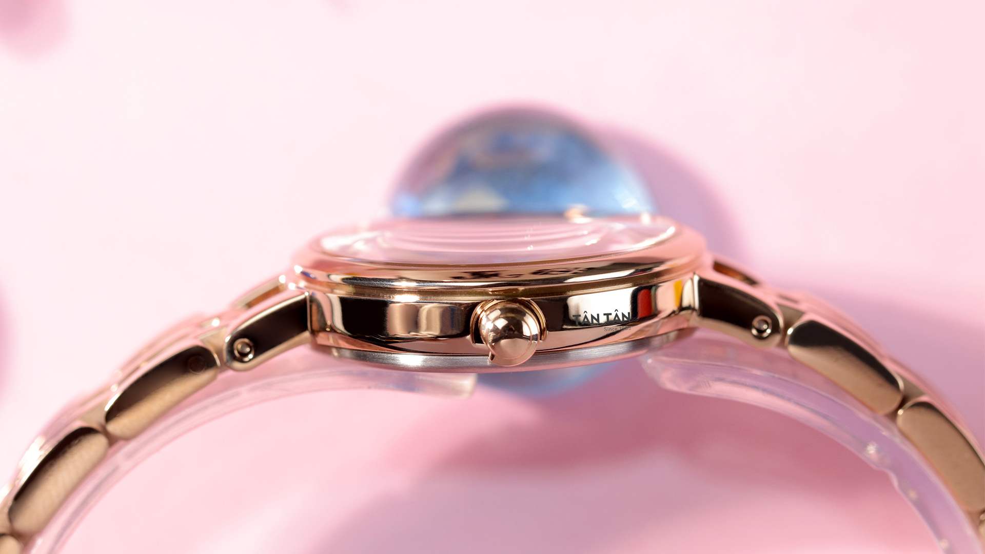 ✓ Dây đồng hồ bằng thép không gỉ thiết kế 5 liên kết nhỏ nhắn, được mạ màu vàng hồng đánh bóng sang trọng liền lạc bởi khóa cân bằng tiện lợi.