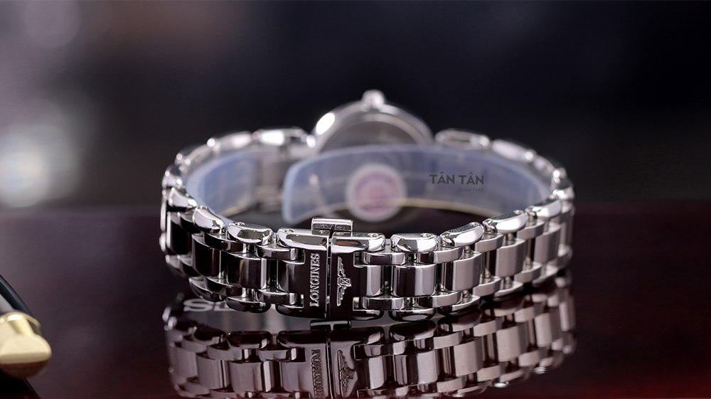 Longines PrimaLuna L8.109.0.87.6 còn được trang bị dây đeo bằng thép không gỉ cao cấp. Mẫu Longines dây đeo kim loại này được thiết kế nhỏ nhắn với các mắt kim loại màu bạc sang trọng liên kết với nhau một cách mềm mại và tinh tế, tạo cảm giác thoải mái, êm ái trên tay người sử dụng. Phía cuối dây đeo là chốt gấp ba lần an toàn cùng cơ chế mở miếng đẩy tối ưu, được in dập logo và dòng chữ Longines khẳng định dấu ấn thương hiệu, tạo nên tổng thể liền mạch và hoàn hảo. Kiểu khóa đặc trưng này có có thể tháo ra - lắp vào dễ dàng, rất an toàn và chắc chắn khi đeo lên tay.
