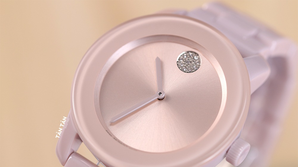 Mặt số Movado 3600804 sở hữu thiết kế 1 chấm 2 kim mang tính nhận diện thương hiệu vô cùng cao, với chấm tròn được đưa lên vị trí cao hơn, không làm nổi khối mà chìm xuống trong mặt số, đính đá swarovski lấp lánh tạo hiệu ứng ánh sáng cực kỳ thu hút, khiến cho mẫu đồng hồ này vốn đã tinh tế, nay còn thêm sự sang trọng và quý phái khó cưỡng. Với thiết kế tinh giản không có cọc số cùng bộ 2 kim pencil thanh mảnh màu hồng của mẫu đồng hồ Movado 3600804 được trau chuốt tỉ mỉ với khả năng bắt sáng cao giúp cho người dùng có thể dễ dàng nhận biết được thời gian ngay cả trong điều kiện thiếu sáng. Tại vị trí 6 giờ chính là góc thể hiện thông tin thương hiệu Movado chuẩn Swiss Made nằm sát cạnh viền vòng ngoài mặt số, khẳng định chất lượng sản phẩm đẳng cấp.