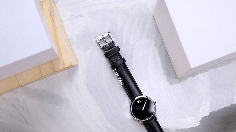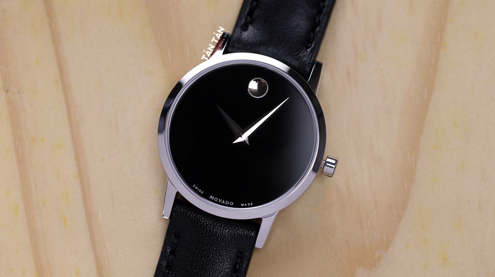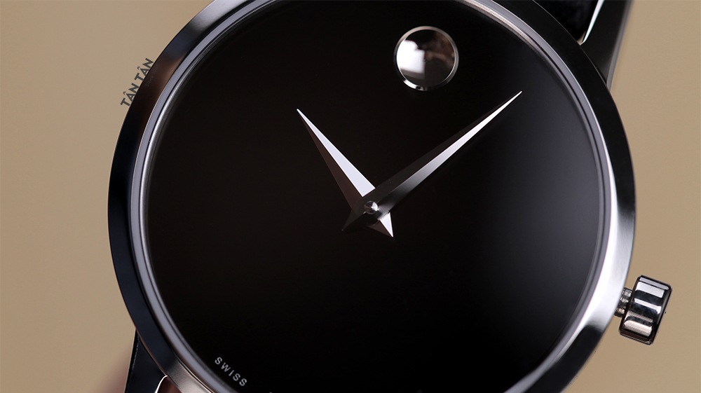 ✓ Mặt số trơn đen tuyền nổi bật “một chấm hai kim” đặc trưng của Movado.