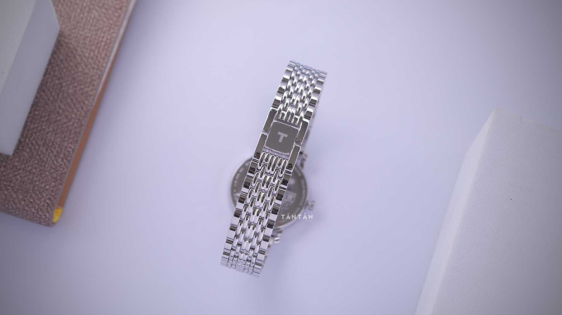 Kết hợp cùng theo đó là khóa cài được cách điệu để mang lại vẻ ngoài nhỏ nhắn, tinh tế cho các quý cô. Điểm mạnh của loại khóa này là sự gọn gàng, chắc chắn giúp bộ dây đeo được liền mạch và ôm trọn lấy cổ tay. Thêm vào đó, trên mặt khóa được khắc chìm logo chữ T đặc trưng của Tissot một cách tinh tế.