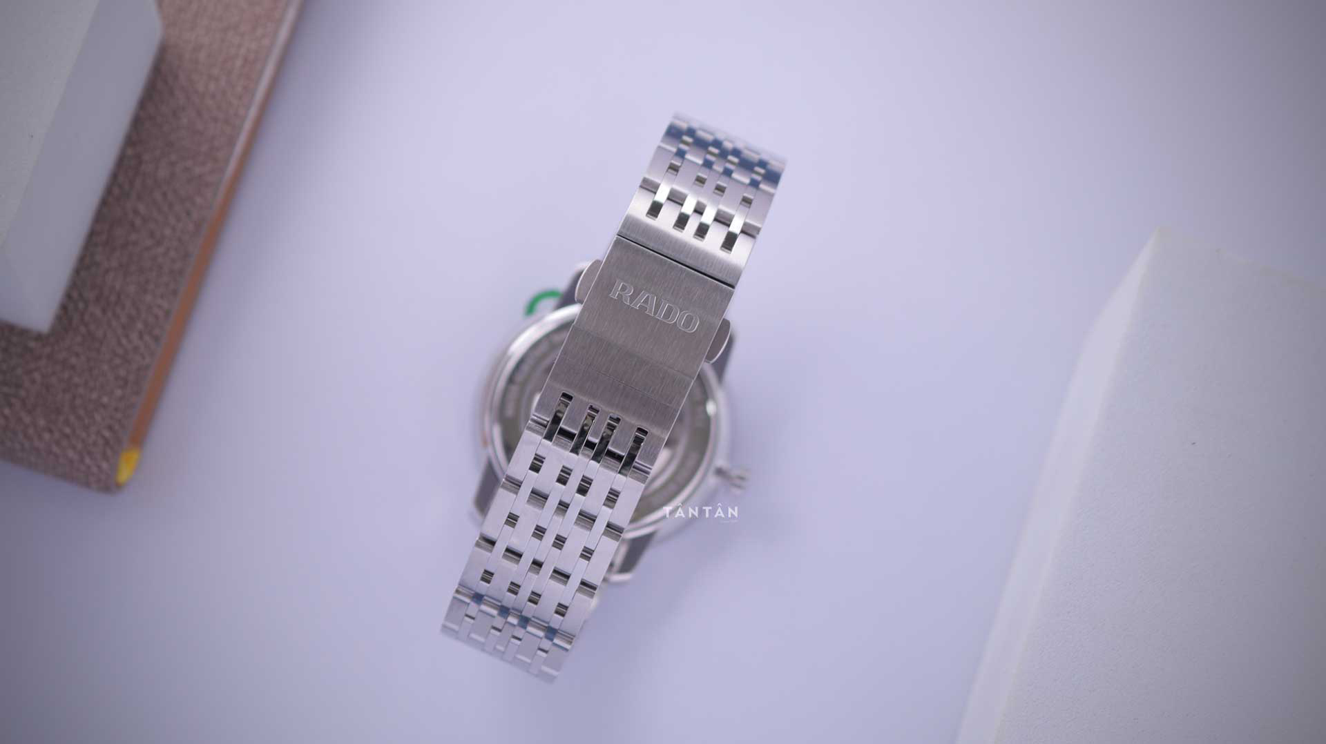 Kết hợp cùng theo đó là khóa gập chắc chắn với nút bấm tiện lợi dễ dàng đeo vào/tháo ra. Vẫn giữ nguyên chất liệu Titanium ở khóa như những mẫu đồng hồ khác của Rado, vừa giúp khóa thêm bền nhẹ vừa tinh tế khẳng định 1 lần nữa danh xưng “ông vua chất liệu” của mình.