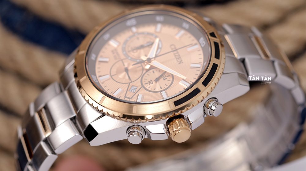 Citizen AN8204-59X sở hữu vẻ ngoài vô cùng mạnh mẽ và bắt mắt. Đặc biệt hơn, bao bọc toàn bộ đồng hồ là chiếc vỏ ngoài màu bạc đặc trưng của chất liệu thép không gỉ tăng thêm sự sang trọng, cứng cáp và dung hòa với tổng thiết kế. Lớp vỏ ngoài được hoàn thiện phay xước tỉ mỉ kết hợp đường line sáng bóng bởi công nghệ tiên tiến của Citizen. Cạnh phải đồng hồ là bộ 3 nút đặc trưng của đồng hồ chronograph với nút chỉnh giờ chính screw-down khía rãnh tinh tế màu vàng hồng và 2 nút bấm giờ trơn nhẵn sáng bóng là một điểm nhấn tinh tế, vừa vặn trên bộ vỏ. Nổi bật phía trên là viền bezel dạng bánh răng mạnh mẽ giống các mẫu đồng hồ lặn chuyên nghiệp mạ màu vàng hồng hơi ngả màu cam đồng giống mặt số, góp phần tôn lên sự nổi bật của mặt số.
