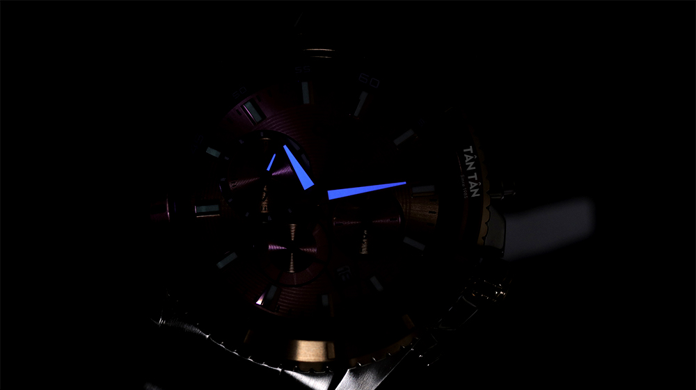 ✓ Bộ 6 kim thể thao, với kim chính dạng dauphine cùng các mốc giờ index nổi khối sắc sảo, mạ màu vàng hồng điểm dạ quang tiện dụng trong điều kiện thiếu sáng.