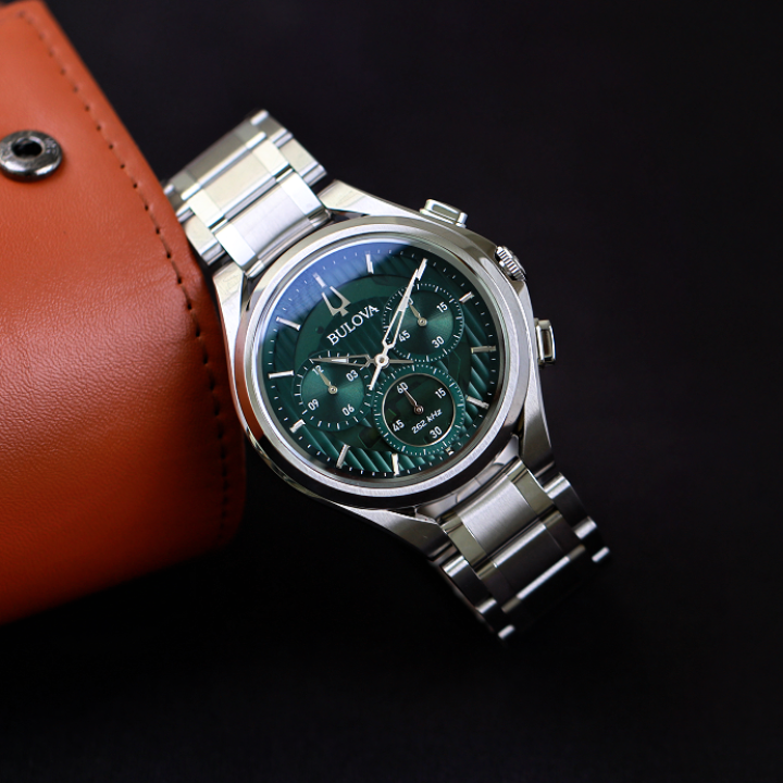 Mẫu Bulova CURV 96A297 có vỏ thép không gỉ tông màu bạc năng động, kết hợp hoàn thiện chải xước phay và đánh bóng cùng mặt kính sapphire cong theo bộ vỏ. Mặt số màu xanh lá cây rực rỡ có hoa văn sọc, vòng trong mờ cho phép bạn nhìn qua bộ máy bên trong. Các mốc giờ và kim Alpha bằng thép không gỉ tông màu bạc mang lại độ tương phản với mặt số, trong khi ba mặt số phụ hiển thị thời gian bấm giờ: 12 giờ, 60 phút và 60 giây. Mặt số phụ chronograph 60 giây ở vị trí 6 giờ tăng gấp đôi so với kim giây tiêu chuẩn. Chế độ kép được thực hiện bằng nút bấm ở vị trí 4 giờ. Bộ vỏ đồng hồ được kết hợp với dây đeo bằng thép không gỉ tông màu bạc thuôn nhọn phù hợp với khóa cân bằng có nút bấm.