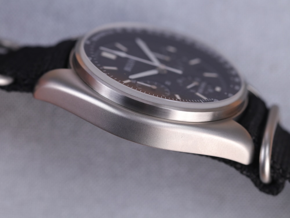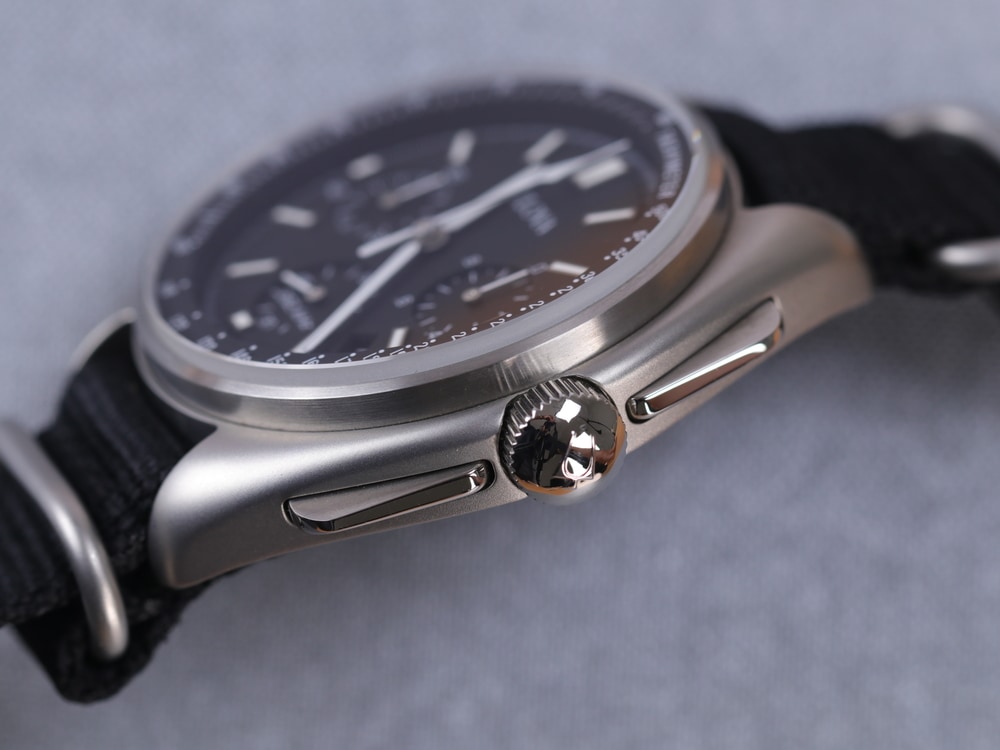 Ở cạnh bên bộ khung là nút bấm Chronograph được thiết kế nổi bật của bộ Bulova Chronograph, hài hòa với tổng thể. Không chỉ vậy, nút bấm còn cho cảm giác bấm đã tay, mang đến trải nghiệm chỉnh giờ vừa ý cho người dùng.