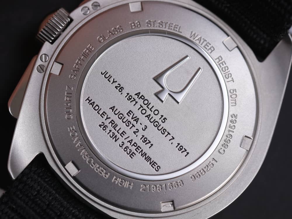 Ở mặt đáy của đồng hồ, ngoài logo thương hiệu được in nổi bật Bulova, nhà sản xuất còn khắc biểu tượng Hành trình Apollo 15, cũng những thông tin quan trọng trong nhiệm vụ như để thể hiện hết ý nghĩa lịch sử của chiếc đồng hồ này. Các thông tin trên mặt đáy bao gồm: