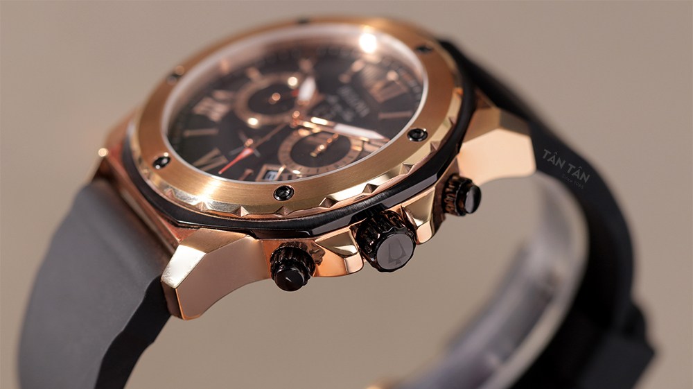 Bộ vỏ của Bulova 98B104 được làm từ thép không gỉ cứng cáp. Đây là chất liệu được sử dụng phổ biến trong chế tác đồng hồ lặn vì khả năng chịu lực và hạn chế ăn mòn rất tốt, giúp bảo vệ bộ máy bên trong một cách toàn diện. Niềng bezel được mạ màu vàng hồng sang trọng với 6 chấm tròn làm điểm nhấn, góp phần tôn lên tinh thần của bộ sưu tập và sự nam tính của người đeo. Ở góc 3h quen thuộc là núm chỉnh giờ được thiết kế khía rãnh tạo sự thuận tiện chỉnh giờ và được đặt trong bộ hai khung cạnh vỏ chắc chắn.Góc 2h và 4h là 2 nút bấm chronograph tương ứng chức năng Start/Stop và Reset đặc trưng đồng hồ bấm giờ thể thao. Bulova 98B104 có đường kính vỏ 44mm, độ dày chỉ 12mm, phù hợp với hầu hết kích thước cổ tay của các chàng, đặc biệt từ 17cm trở lên. Bên cạnh đó, đồng hồ có khả năng sở chống nước 10ATM (tương đương áp suất ở độ sâu 100 mét nước), hỗ trợ phái mạnh thoải mái đi mưa, rửa tay hoặc đi bơi.