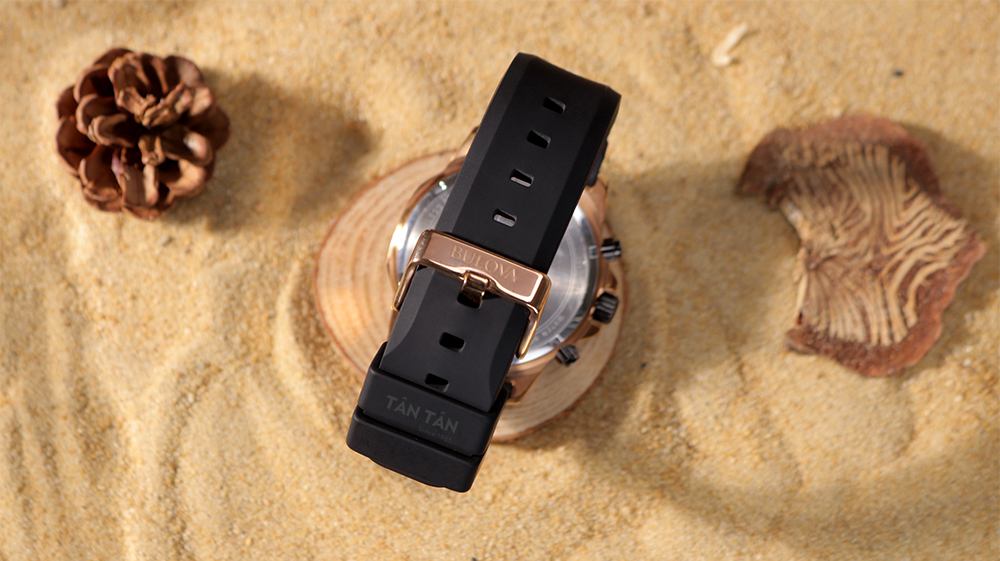 Bên cạnh đó, Bulova 98B104 còn được trang bị dây đeo cao su chính hãng vô cùng mềm mại và dẻo dai. Chất liệu dây đeo bằng cao su cao cấp tạo cảm giác nhẹ nhàng và linh hoạt khi sử dụng. Đây là chất liệu thường được ứng dụng ở những chiếc đồng hồ lặn diver-watch bởi khả năng hạn chế ăn mòn từ nước biển. Đặc biệt, dây đeo có độ ôm nhất định và thiết kế tối giản giúp làm nổi bật các chi tiết trên mặt số. Đi kèm với dây đeo là khóa cài tiện lợi, dễ dàng đeo vào - tháo ra và chắc chắn trên cổ tay.
