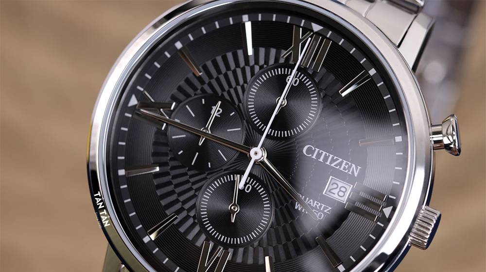 Citizen AN3610-71E sở hữu mặt số màu đen hài hòa với tổng thể đi cùng các vân đồng tâm bắt mắt. Vẫn là cách thiết kế truyền thống của dòng đồng hồ Chronograph nhưng Citizen sắp xếp các chi tiết rất khoa học và thẩm mỹ, khiến đồng hồ trở nên thu hút hơn hẳn. Mặt số hai lòng với vòng trong hoàn thiện vân guilloche với các nếp gấp quạt xếp chồng nhau tạo chiều sâu được bao quanh bởi các vòng tròn đồng tâm ở lòng ngoài.