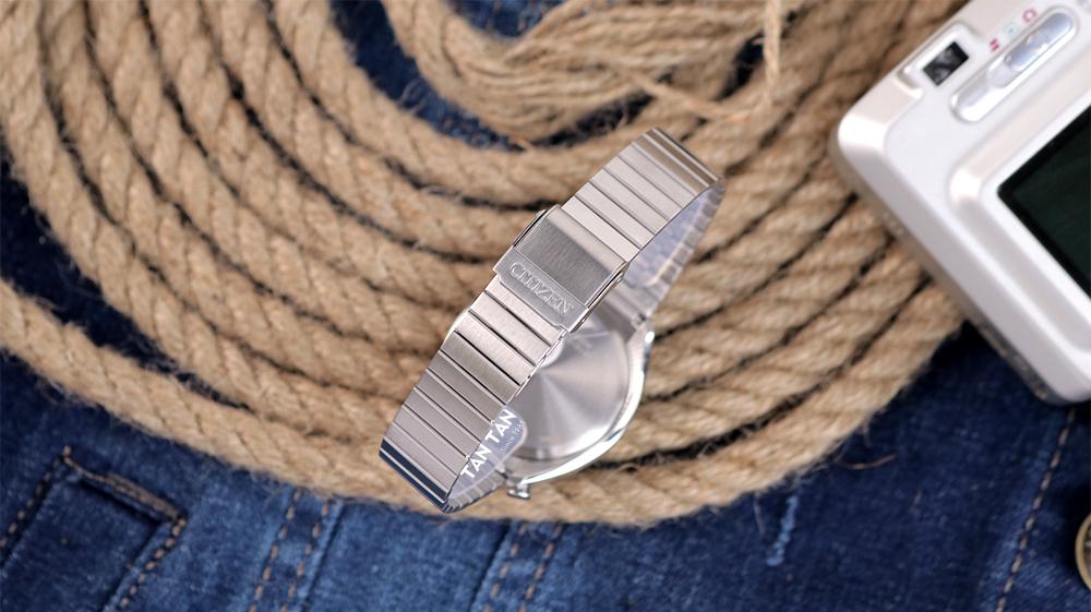 Điểm thiết kế đặc biệt bên ngoài Citizen AN3660-81L chính là dây đeo được liên kế liền lạc với thân vỏ đồng hồ giấu đi phần tiếp nối bên dưới tinh tế. Dây đeo đi kèm cũng được làm không gỉ nguyên khối dạng mắt đơn gắn kết liền lạc với nhau cho khả năng ôm trọn cổ tay. Bộ dây thép của Citizen AN3660-81L được đánh phay xước đồng nhất với phần khung tạo nên vẻ cao cấp và hạn chế trầy xước tối đa. Đi kèm bộ dây là khóa gập 2 lớp gọn gàng và chắc chắn được uốn cong khớp với dây da, dễ dàng tháo ra và đeo vào. Dây đeo với cơ chế trượt vào để đóng nên linh hoạt điều chỉnh độ rộng, vừa vặn với kích thước cổ tay.
