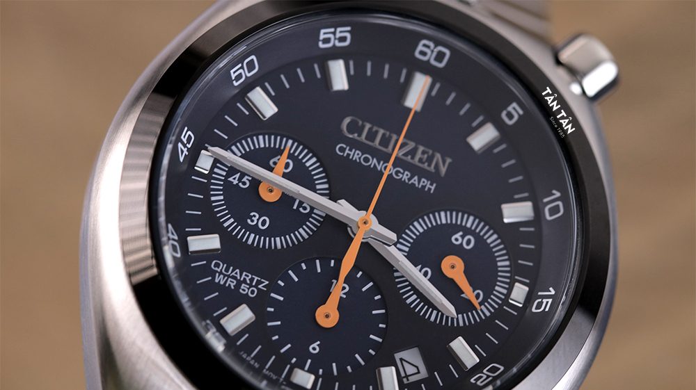 Ba mặt số phụ thể hiện mỗi chức năng khác nhau gồm: mặt số đo thời gian Chronograph chạy 60 phút ở trên mốc 9h, mặt hiển thị tính số giờ ở gốc 6h và kim giây chính ở gốc 3h. Tất cả các mặt số phụ điều được làm cân đối nhau có màu xanh dương, làm chìm xuống cùng các chi tiết màu trắng vừa nổi bật, vừa hài hòa trên nền mặt số xanh dương. Đồng hồ sở hữu kích thước vỏ 38mm đây là một kích thước được giữ nguyên từ phiên bản Citizen Bullhead 1972. Ngoài ra phần vỏ đồng hồ cũng được thiết kế gắn liền với dây đeo nên là kích thước đồng hồ sẽ vừa phải. Các quý ông có cổ tay từ 15cm sẽ đeo đẹp hơn với phiên bản đồng hồ nam này.
