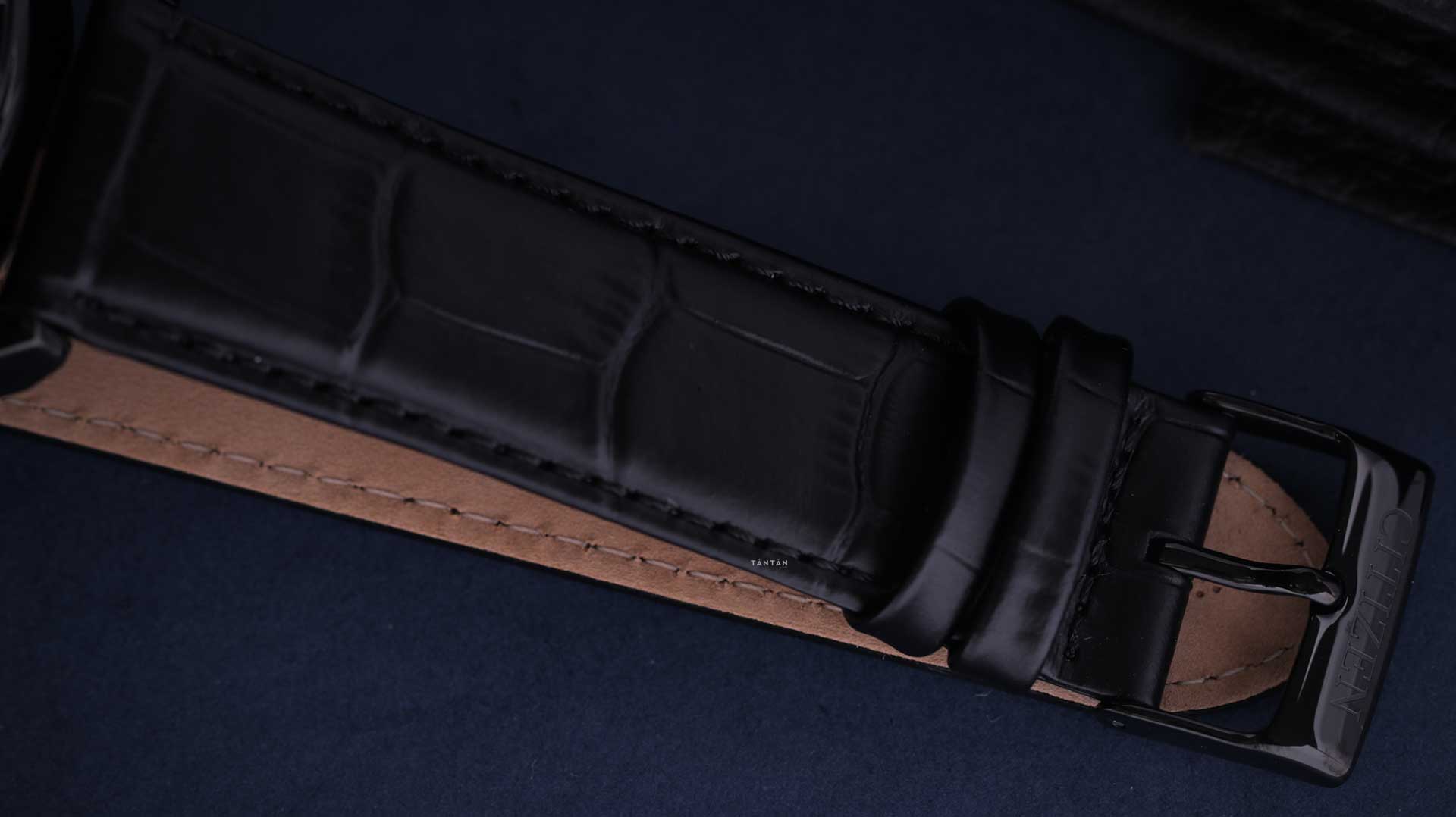 Citizen BI5095-05E được trang bị dây da cao cấp, bền nhẹ thuộc đen bề mặt tạo nên vẻ ngoài trưởng thành và lịch lãm hơn. Lựa chọn sử dụng chất liệu da thật bền bỉ, dập vân da cá sấu gam màu đen, Citizen mong muốn mang đến cho người dùng cảm giác mỏng nhẹ, êm ái và thoải mái khi đeo. Bởi vì dây đeo của Citizen BI5095-05E có cấu trúc 2 lớp được may chắc chắn bởi đường chỉ tỉ mỉ dọc viền dây, với lớp da bên trong mềm mại tránh kích ứng da và gây khó chịu khi đeo trong thời gian dài. Đi kèm với dây da là khóa cài đơn giản, dễ dàng đeo vào - tháo ra cố định chắc chắn trên cổ tay.