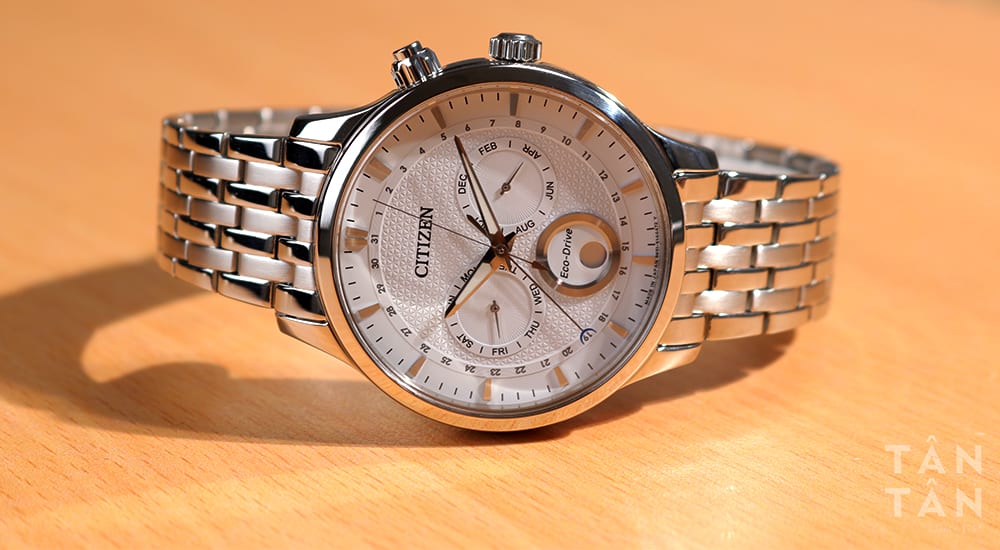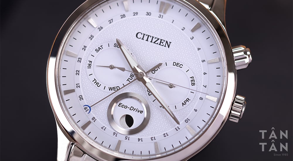 Citizen AP1050-56A nằm trong BST Citizen Moon Phase với góc 6 giờ là ô hiển thị Moon Phase (lịch tuần trăng) được viền kim loại sáng bóng, cửa sổ này giúp người dùng đoán được ngày âm trong lịch vạn niên dựa trên kỳ trăng. Tính năng Moon Phase sẽ hiển thị đúng hình dạng trăng thực tế hằng ngày, để người dùng biết được ngày rằm hoặc đầu tháng mà không cần phải “search Google”