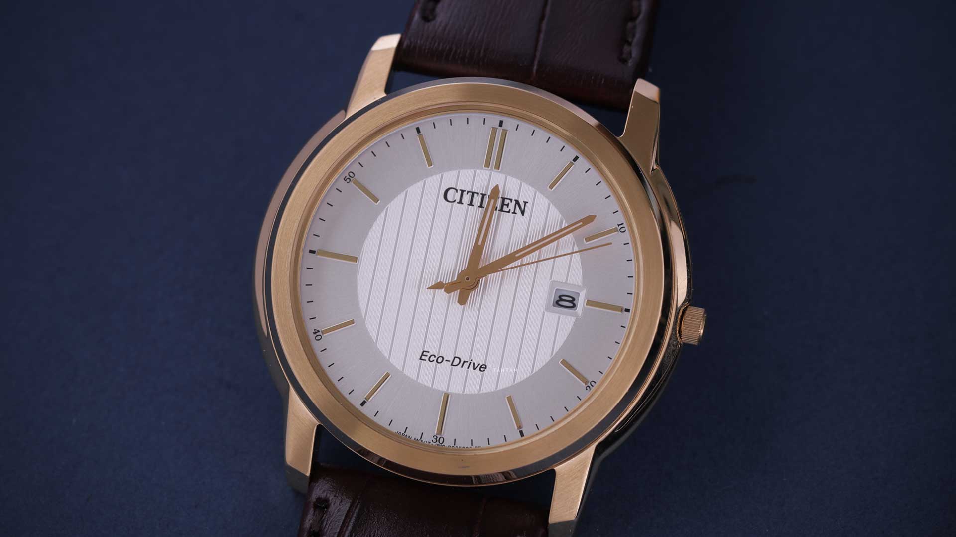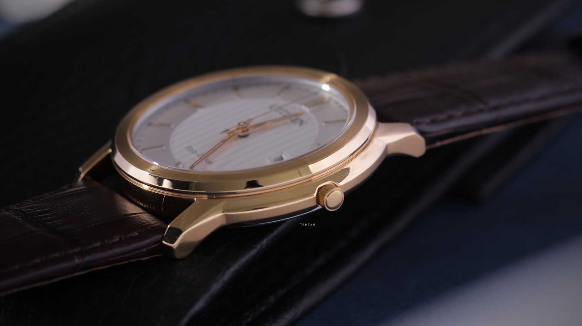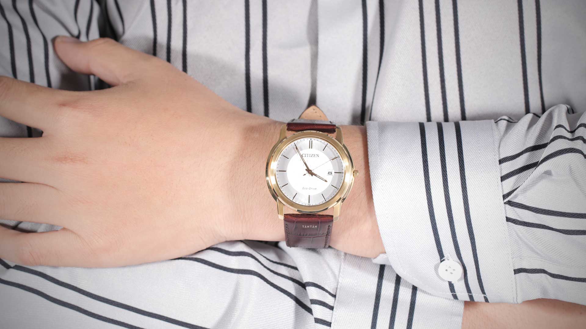 Nhắc đến những thiết đề đồng hồ nam tinh xảo và thanh lịch, bạn không thể bỏ qua những thiết kế đến từ thương hiệu Citizen. Nổi bật trong số đó là mẫu đồng hồ Citizen AW1212-10A với tông màu vàng, nâu, trắng trang nhã, cực kỳ phù hợp với những anh chàng theo đuổi phong cách thanh lịch. Đặc biệt, chiếc đồng hồ này còn được trang bị công nghệ vận hành bằng ánh sáng độc quyền Eco-Drive, mang đến cho phái mạnh trải nghiệm sử dụng tuyệt vời nhất.
