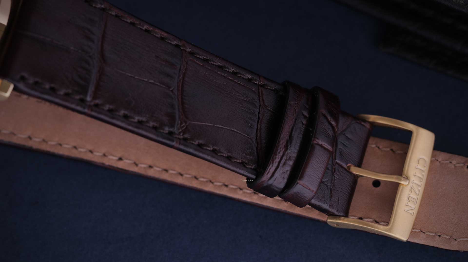Ngoài ra, chiếc đồng hồ nam chính hãng Citizen này còn được trang bị dây đeo bằng chất liệu da cao cấp thuộc nâu, giúp người đeo thêm phần trẻ trung và cuốn hút. Phần thân dây được dập vân cá sấu độc đáo, dọc thân có hai đường chỉ thẳng tắp tạo độ chắc chắn cho dây đeo. Cuối dây đeo là phần khóa cài nhỏ gọn thường thấy, có thể dễ dàng tháo ra - lắp vào trong quá trình sử dụng.