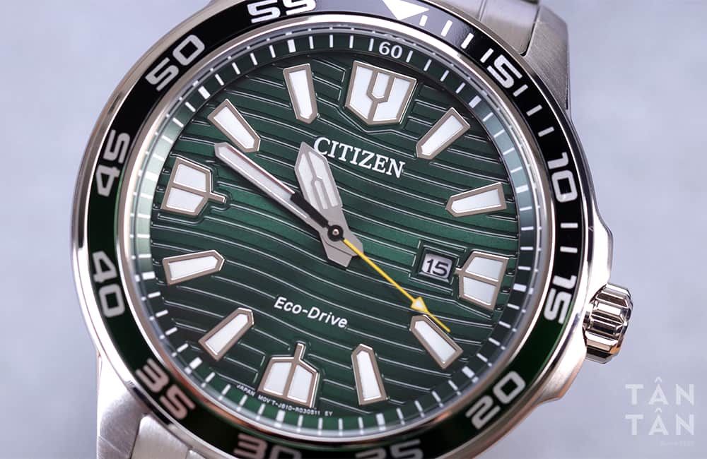 Citizen AW1526-89X được trang bị mặt số màu xanh lá với những đường vân họa tiết dập dìu tựa như sóng biển để nhấn mạnh tinh thần bơi lặn của sản phẩm. Họa tiết sóng biển được khắc chìm nổi tạo hiệu ứng bắt mắt và uyển chuyển trong từng đường nét. Ngoài ra, Citizen AW1526-89X còn có thêm một phiên bản màu xanh dương rất đặc sắc để người dùng lựa chọn.