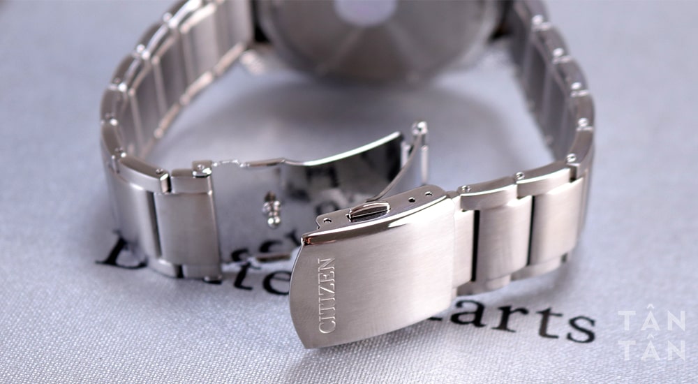 Ngoài ra, vì nằm trong thiết kế đồng hồ Citizen dây kim loại nên dây đeo Citizen Nam AW1526-89X được chế tạo từ thép không gỉ đánh thớ mờ sang trọng và hạn chế trầy xước. Dây đeo được trang bị khóa gập với nút bấm thông minh giúp người dùng thuận tiện thao tác gập mở và đảm bảo đồng hồ luôn chắc chắn trên tay.