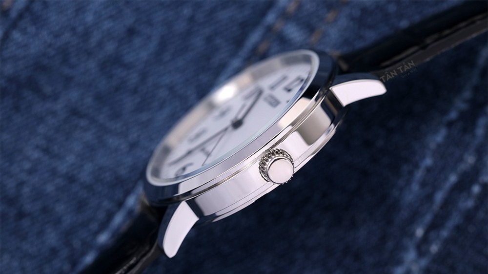 Mặt số bo tròn trắng trang nhã làm nổi bật bộ kim stick, các mốc giờ arab màu đen
