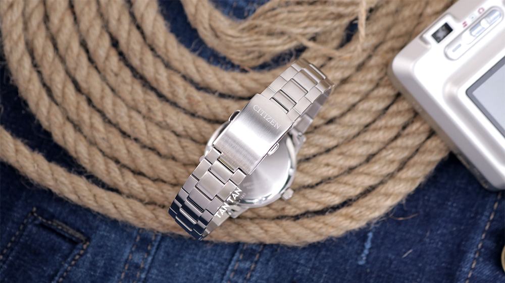 Thiết kế dây đeo 3 mặt quen thuộc với các mắt dây hoàn thiện sớ mờ càng tô điểm thêm sự phong trần đúng chuẩn một quý ông lịch lãm. Đi kèm theo dây đeo kim loại là khóa gập quen thuộc được Citizen trang bị trong những mẫu đồng hồ của mình, mang đến sự chắc chắn không bị bung ra khi vận động mạnh.
