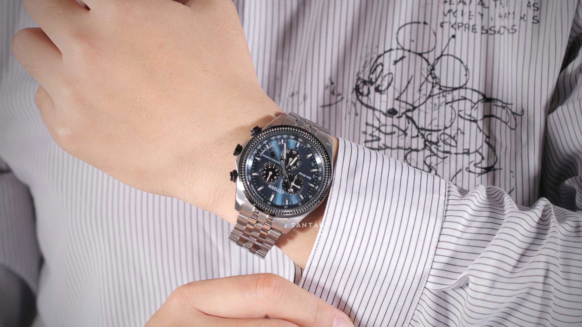 ✓ Mặt số xanh dương đa dạng chức năng được thiết kế khoa học, ấn tượng: chronograph, báo thức, giờ địa phương, lịch ngày.