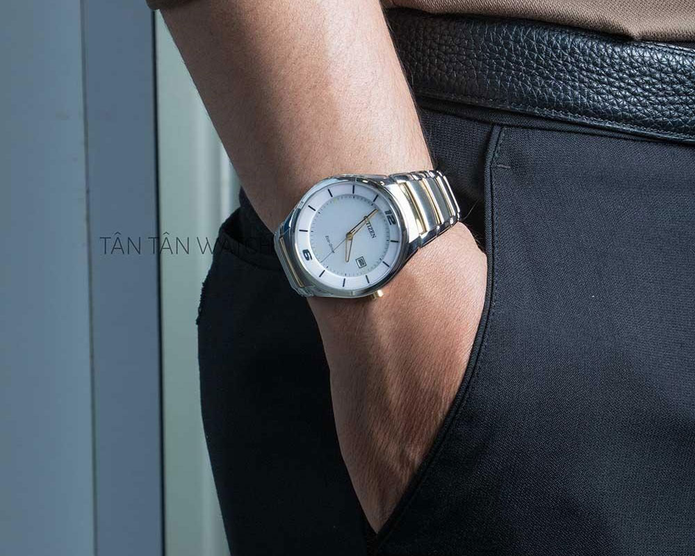 Bên cạnh đó, Citizen BM6958-58A thiết lập ô cửa sổ lịch ngày tại vị trí 3h cho người dùng tiện lợi sắp xếp và quản lý thời gian. Mặt kính sapphire có vai trò bao phủ và bảo vệ các chi tiết hoàn mỹ bên trong, chất liệu kính vượt trội hơn cả về đặc tính trong suốt, chống trầy xước hiệu quả mang đến một cái nhìn mãn nhãn cho người xem. Tổng thể đồng hồ được thiết kế hài hòa, kết hợp giữa màu trắng bạc của thép không gỉ và điểm thêm màu vàng gold ở núm chỉnh giờ và dây đeo. Phần vỏ bo tròn của Citizen BM6958-58A được làm từ thép không gỉ 316L cứng cáp chống va đập và hạn chế ăn mòn, bảo vệ an toàn tuyệt đối cho bộ máy bên trong.