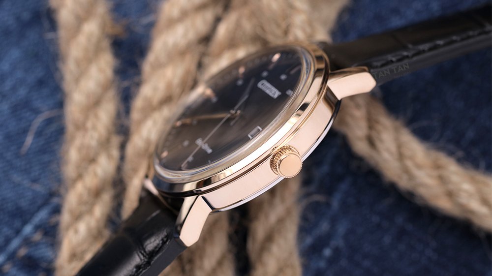 ✓ Bộ kim Dauphine sắc sảo cùng các mốc giờ nổi khối mạ màu vàng hồng sáng bóng nổi bật.