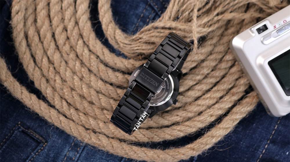 Tương tự hầu hết những thiết kế Citizen nam dây kim loại, Citizen BM7527-89E được trang bị loại dây thép không gỉ 316L nguyên khối có độ chắc chắn cao, được thiết kế kiểu dáng H-link độc đáo. Toàn bộ phần dây đồng hồ được mạ thẩm thấu ion đen, đánh thớ mờ ở phần chữ H và đánh bóng ở các liên kết giữa, có tác dụng hạn chế nhìn thấy các vết trầy xước nhẹ, mang đến nét thẩm mỹ hiện đại, giúp đồng hồ luôn đẹp theo thời gian.